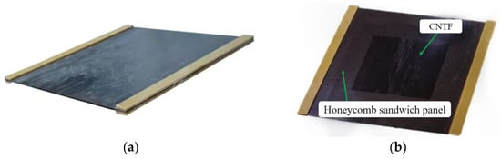Two specimens of honeycomb sandwich composite panels were used in this study. One was the unprotected specimen (designated as NS80), and the other was the protected specimen (designated as PS80) containing CNTF on the surface. The fabrication process of the two specimens was consistent, and the configurations and dimensions of the two specimens are shown in Figure 3.