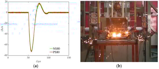 Acquisition results of simulated lightning strike test: (a) test current waveform; (b) simulate lightning test phenomenon.