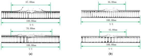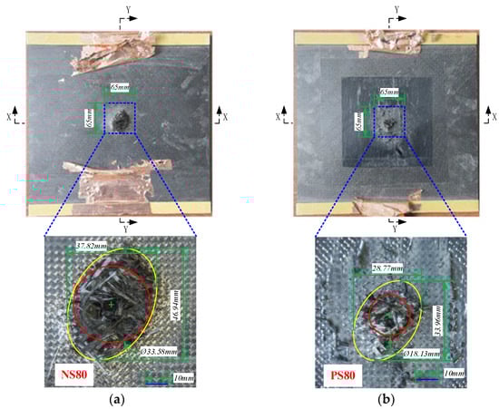 It can be clearly seen from the data in the table that when the peak current was 80 kA, the surface “damage area” and internal “delamination length” of the honeycomb sandwich specimen with CNTF on the surface were reduced by 43.49% and 34.29%, respectively, compared with the unprotected specimen. These data demonstrate the lightning protection effect of CNTF on honeycomb sandwich panel.