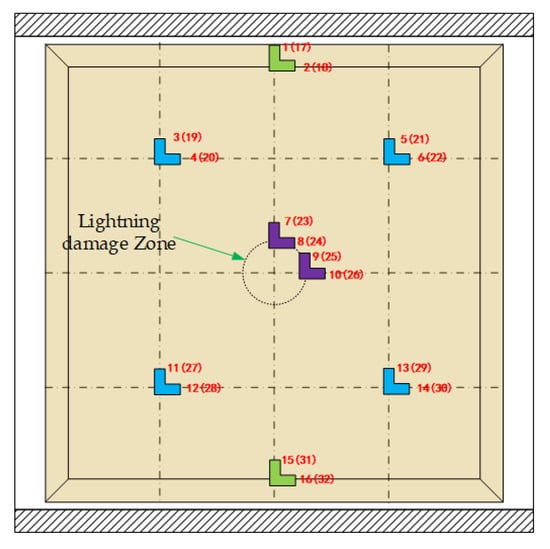 To study the damage distribution of a honeycomb sandwich panel specimen in the axial compression test process, resistive strain gauges were pasted on the weak zone of the specimen for damage detection in the compression process. The final strain gauge layout of the honeycomb sandwich specimen is shown in Figure 10.
