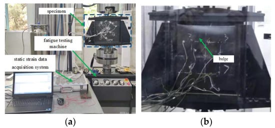 As the size of the specimen was relatively large, a special compression test fixture was manufactured for this purpose. The test status is shown in Figure 11. During the axial compression test, the displacement was loaded by a multifunctional fatigue testing machine (Landmark 370.50, MTS Systems Co., Ltd., U.S.A) at a loading speed of 0.5 mm/min. The strain data of the two specimens during the compression test were collected by a static strain data acquisition system (JM3813, Yangzhou Jingming Technology Co., Ltd., Yangzhou, China).