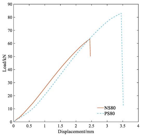 The load-displacement curves of the unprotected specimen (NS80) and the protected specimen (PS80) are shown in Figure 12. It can be seen from the figure that the curves of the two specimens changed approximately linearly before the specimens failed, and the data in the figure show that the residual compression strength of the protected specimen was much larger than that of the unprotected specimen. The strain changes of different parts of the specimen during compression are shown in Figure 13. From the variation trend of strain in the figure, we can roughly judge the damage initiation, distribution and evolution in the specimen.