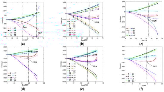 Strain collection results of specimens: (a) the first group strain results of the NS80 specimen; (b) the second group strain results of the NS80 specimen; (c) the third group strain results of the NS80 specimen; (d) the first group strain results of the PS80 specimen; (e) the second group strain results of the PS80 specimen; (f) the third group strain results of the PS80 specimen.