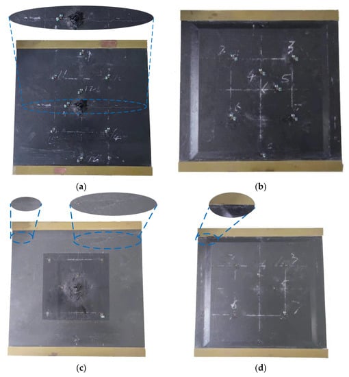 As observed in Figure 8 and Figure 9, the outer skins of the honeycomb sandwich specimens were penetrated by the simulated lightning strike. Thus, in the finite element model, the lightning damage of the outer skins and outer films are simplified as circular holes, as shown in Figure 15. The diameters of the holes in outer skins are consistent with the red fiber damage circles in Figure 8, while the diameters of the holes in outer films are consistent with the “delamination length” of the specimens in Figure 9. The size data of the lightning damage for different types of specimens in the models are shown in Table 7.