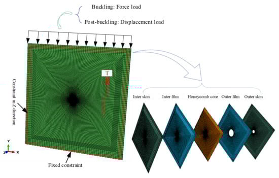 In the finite element model, the equivalent model of honeycomb core in the specimen was built based on sandwich plate theory [,]. Considering the damage of the honeycomb core during the compression process, the failure and damage evolution of the honeycomb core were determined by writing a user-defined field variable subroutine (USDFLD) based on Besant criterion [] and direct stiffness degradation theory [].