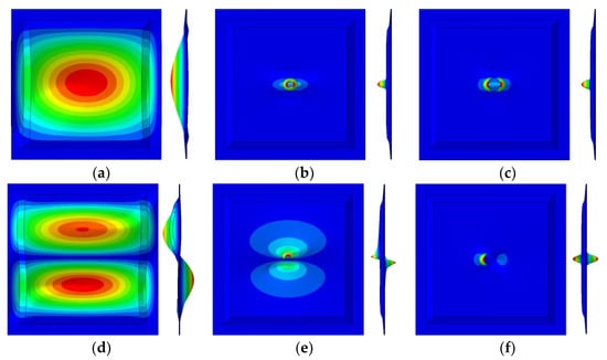 Compressive buckling modes of specimens: (a) first order buckling mode of the NS00 specimen; (b) first order buckling mode of the PS80 specimen; (c) first order buckling mode of the NS80 specimen; (d) second order buckling mode of the NS00 specimen; (e) second order buckling mode of the PS80 specimen; (f) second order buckling mode of the NS80 specimen.