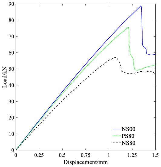 To predict the residual compressive strength of the honeycomb sandwich specimen after a lightning strike, it was necessary to introduce the initial geometric defects into the nonlinear postbuckling analysis of the specimen. The node displacement data of FBM was introduced into the nonlinear buckling model as the initial defect for failure analysis, and then the failure loads and failure modes of specimens were obtained by nonlinear buckling analysis. The load displacement curves of the NS00 specimen, the PS80 specimen and the NS80 specimen obtained through numerical simulation are shown in Figure 17. As can be seen from the curves in the figure, the residual compressive strength of the PS80 specimen is not significantly different from that of NS00, while the residual compressive strength of the NS80 specimen decreased significantly.