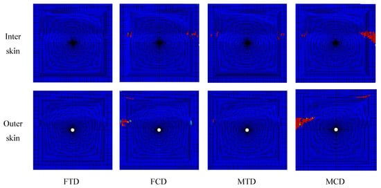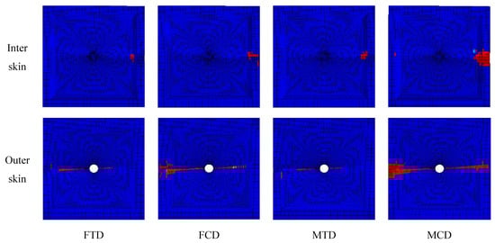 The skin damage distribution of the NS00, PS80 and NS80 specimens is shown in Figure 18, Figure 19 and Figure 20, respectively. The red part represents the damaged element, while the blue part represents the undamaged element, respectively. According to the two-dimensional Hashin criterion mentioned above, the skin damage types can be mainly divided into four categories: fiber tensile damage (FTD), fiber compression damage (FCD), matrix tensile damage (MTD) and matrix compression damage (MCD).