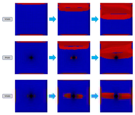 The damage distribution of the honeycomb core of the NS00, PS80 and NS80 specimens is shown in Figure 21. Similar to the skin damage, the red part represents the damaged element, and the blue part represents the undamaged element.