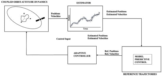 A schematic of DAMPC is shown in Figure 1. It can be seen that the reference trajectory is generated using MPC. Then, the adaptive control is combined with feed-forward trajectories using MPC to control the actual spacecraft system. For the purposes of this paper, it is assumed that the estimated positions and velocities are readily available to the control system.