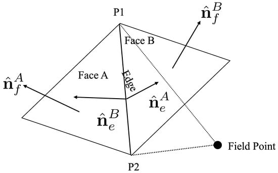 A polyhedral model was developed using a triangular facet with three vertices. Each edge of the facet is the boundary between two facets, as shown in Figure 3. Here, is the vector from the field point (spacecraft position in the asteroid body frame) to any point on the face plane. The vector is a unit vector normal to the face plane. Each triangular facet is associated with its own coordinate frame (), where is aligned with the normal vector . The vector is a vector from the field point to any point at the edge e. Each edge has a normal edge vector, which is normal to the edge vector and the face normal vector . Here, the edge vector is the vector along the edge of the facet. Each edge is associated with two edge normal vectors (one for each face plane), namely and . The edge and face dyad constants are given as