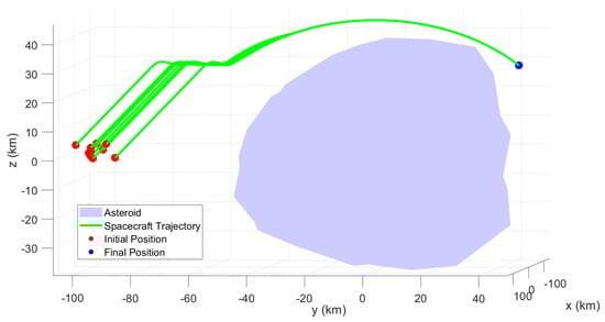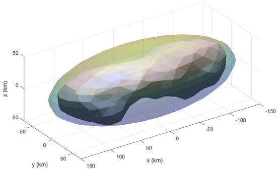 Asteroid Kleopatra was chosen for the simulation. The asteroid properties were taken from NASA’s Planetary Data System (PDS) [23]. The properties of the asteroid and the spacecraft can be found in Table 1 and Table 2. Asteroid Kleopatra is a metallic ham-bone-shaped asteroid with a highly irregular gravitational field. The system dynamics were integrated using the Runge–Kutta fourth-order (RK-4) method with a time step of 1 s.