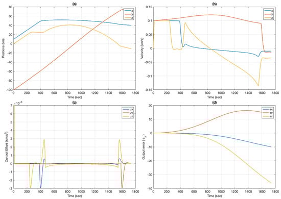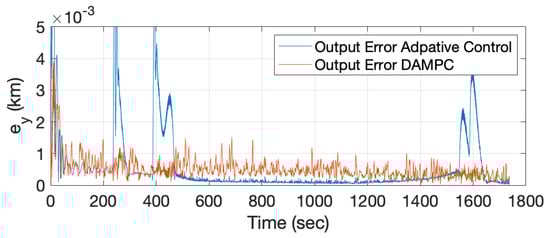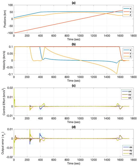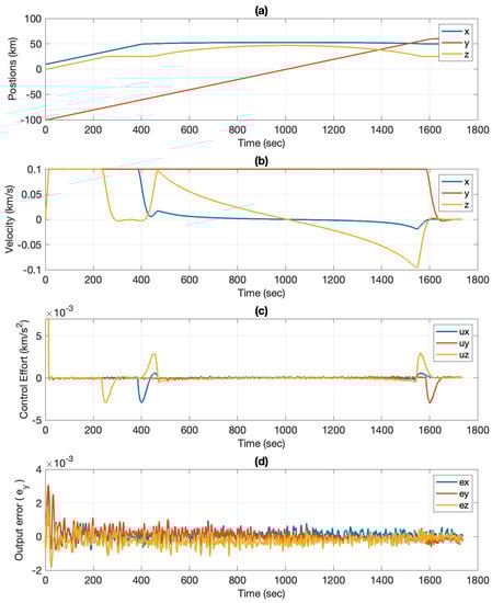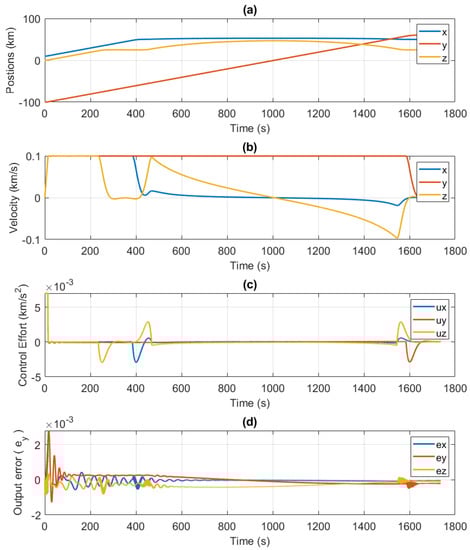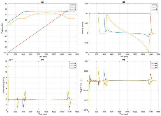 The tracking performance of DAMPC is better than that of the adaptive control, as shown in Figure 11d. This is due to the fact that DAMPC is able to excite the system with non-zero control effort, unlike the adaptive control system. This prevents overshooting and chatter in the control system. This effect can be seen in Figure 11c and compared to the case where only adaptive control was implemented (see Figure 8). The position and velocities are shown in Figure 11a,b. It can be seen that the position and velocities converge to the desired values. It should be noted that constraining the velocity helps to keep the control effort low. Increasing the velocity limit requires more control effort or increases the duration of the mission, which requires more on-board fuel. The output error () is shown in Figure 11d and is significantly less than in the adaptive control case, thus demonstrating the improved performance over the adaptive control.