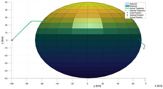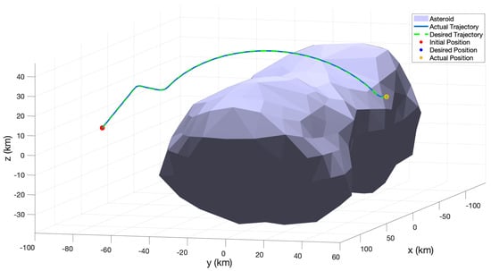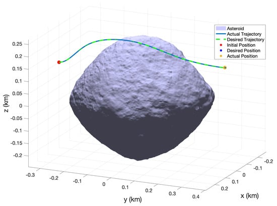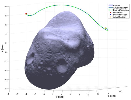 The desired and actual trajectories after implementing MPC feed-forward only can be seen in Figure 5. In this case, it can clearly be seen that the trajectories diverge significantly. This is due to the fact that the NMPC control inputs are calculated using the two-body approximation of the system model as given in Equation (10). In the case of asteroid Kleopatra, the gravitational model is better represented by a polyhedral gravity model due to its highly irregular shape and total mass. In addition, as the duration of the mission becomes longer, the divergence from the desired position also increases and causes even more drift. The output error can be seen in Figure 6d. The position and velocities are given in Figure 6a,b, respectively.