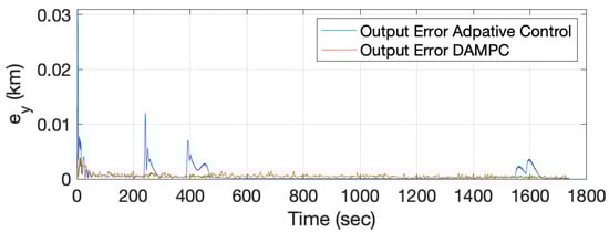 Figure 14 shows the comparison between the output errors for a noisy system with adaptive control and DAMPC. It can be seen that although the adaptive control is able to handle disturbances, the DAMPC control is also able to avoid overshoot in the output error and keep the overall output error normalized. A zoomed-in plot is shown in Figure 15.
