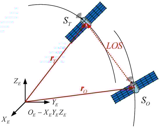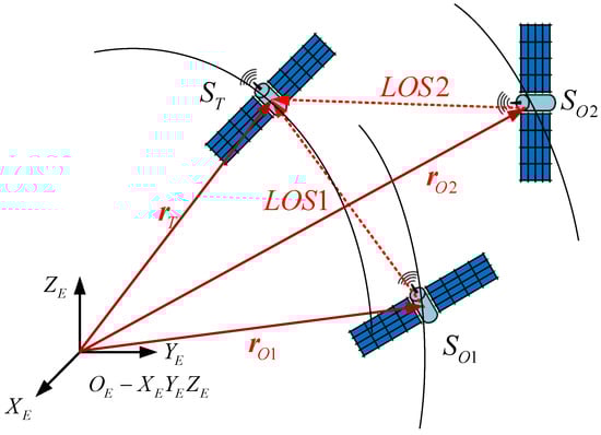 where and are the LOS measurements taken by the two-observation spacecraft. The measurement model is shown in Figure 7, and are observation spacecraft.