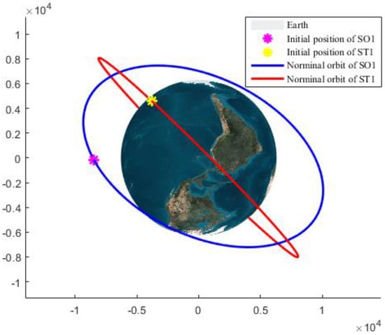 where k is an integer. Equations (18) and (19) mean that the two orbits are not coplanar, and Equation (20) reflects that they have different sizes and shapes. The orbits are shown in Figure 2.