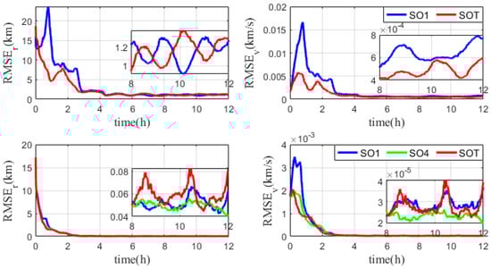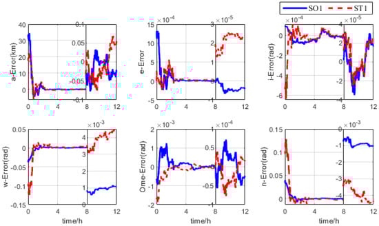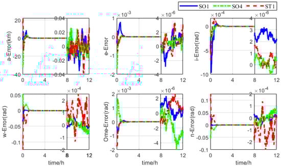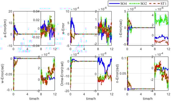 Taking the case in which SO1 observes ST1 as a numerical example, the errors of orbit elements are shown in Figure 3. The estimation errors converge within four hours, and the sub-windows show the local magnifications of the estimation errors within 8–12 h. The estimation accuracies of semi-major axes are within 0.1 km, the accuracies of eccentricities are within 3 × 10−5, the accuracy of reaches the level of 10−5, the estimated accuracies of , and reach the level of 10−4.