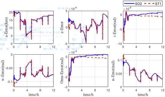 Let SO1 and SO4 observe ST1, and the orbits are shown in Figure 8. The rank of OM is calculated to be 18, as expected, and the observability of cooperative OD system is enhanced, reflected in the fact that the numerical value of CN decreases to 6.7037 × 103. The errors in Figure 9 show that the accuracies of semi-major axes are around 20 m, the estimated errors of eccentricities reach the level of 10−6, the estimated accuracies of and reach the level of 10−6, and the estimated accuracies of and reach the level of 10−4.