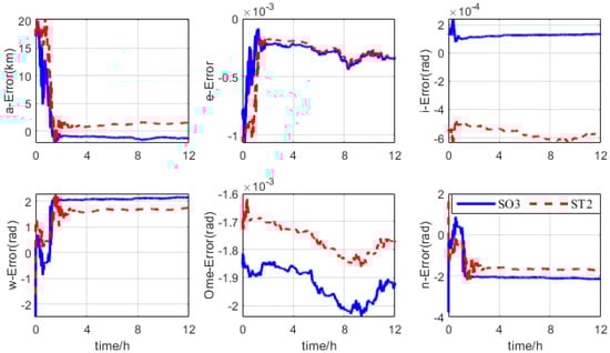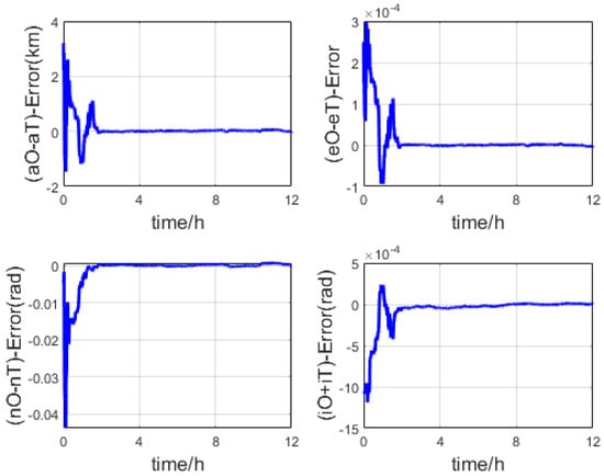 The estimation errors of orbit elements over time are shown in Figure 6. It can be seen that the errors of and are not convergent, proving that the 10 elements are unobservable. For the errors of , there are tendencies of convergence, but the accuracies are not high due to the influence of other orbit elements.
