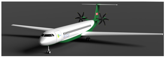 Figure 1 shows the SE²A (the Cluster of Excellence SE²A—Sustainable and Energy Efficient Aviation—investigates future aircraft types, by following an interdisciplinary approach) short range (SR) aircraft with foldable wings and a high aspect ratio. The SE²A SR version 1 (SRV1) features an all-electric propulsion system with two fuselage-mounted electric motor-driven propellers. Concerning the battery energy, a cell energy density of 800 Wh/kg was assumed to be reached by the year 2050 [1].