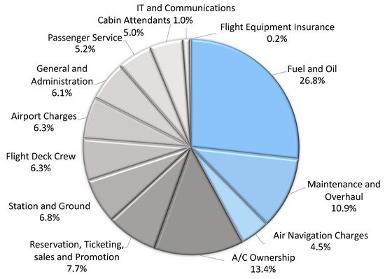 In Figure 2, Eurocontrol [4] provides an overview of an airline cost structure, covering data derived from 61 airlines. As shown in Figure 2, a variety of costs addresses the business model of an airline. Those are Indirect Operating Costs (IOC), such as the costs for sales and ticketing. The direct operating costs addressed in this paper are marked in blue and can be derived from general available data, such as the aircraft specifications or fees of air navigation service providers. The aim is to provide estimation functions which can be applied in various contexts with little computational effort and which are related to the particular characteristics of the aircraft type or the seat load factor. In a possible future step, other cost aspects of Figure 2, such as airport charges or specific airline business models, could be implemented additionally. Since IOC are not freely available, they will be omitted in this paper.