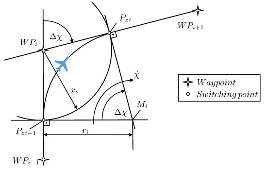 Here, is the gravitational acceleration. The control input, bank angle , is based upon the amount of course angle change between the two flight legs and ranges between 15° and 35°. The distance between the initial switching point and the so called fly-by waypoint is ensured by Expression (2) [10]. Thus, the switching point can be set, if is known.