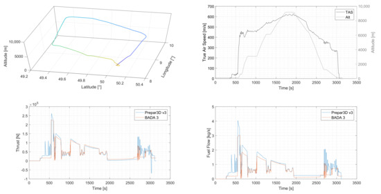 In the lower left part of Figure 4, the input of thrust from the human operator is represented as the blue line. The implemented BADA model detects the distinct phases of flight and applies the respective thrust configurations. For example, during the taxi phase between approx. 280 s and 520 s, different inputs from the human operator can be observed. This is common procedure during that phase. The estimation of the BADA model for this phase on the other hand assumes a constant thrust. Varying human inputs can also be observed during the landing phase between approx. 2800 s and 3000 s.