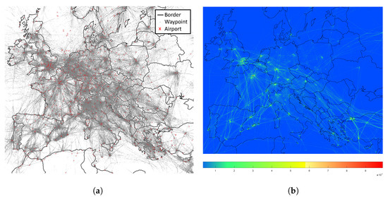 Air traffic situation across Europe. (a) Cutout of European airports, airfields and oil rigs and related waypoints of the so6-M3 data set of the 25 August 2018. (b) Corresponding heat map of the data set, using interpolated waypoints.