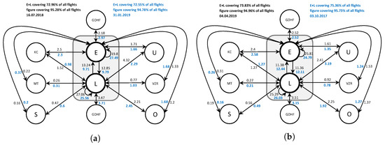 Figure 8a,b illustrate the traffic flow among the different ICAO regions with respect to the European airspace for selected days. As one aspect, the differences between the particular summer and winter season are revealed in this depiction. For example, the flow between U and L in Figure 8a decreases by up to 48% between the month of July and January. Due to missing data of particular months of a year, the calculation illustrated in Figure 8a,b were performed by means of data of different years. This is because so6 data became unavailable for public access and not all data could have been secured.