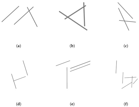 Examples of exceptional runway configuration layouts, generated by the algorithm with relation to the Horonjeff classification. (a) Helsinki-Vantaa ICAO: EFHK, RWC: C. (b) Chalgrove ICAO: EGLJ, RWC: H. (c) Zurich ICAO: LSZH, RWC: M. (d) Rome–Fiumicino ICAO: LIRF, RWC: L. (e) Frankfurt am Main ICAO: EDDF, RWC: M. (f) Amsterdam Schiphol ICAO: EHAM, RWC: E.