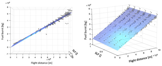 The proposed approach calculates the amount of fuel burnt, depending on the distance of the particular flight leg between two airports i and j, and the respective seat load factor, . The latter representing the utilization of the available seats of a particular type of aircraft t at the flight between i and j. The amount of fuel burnt can thus be formulated as follows: