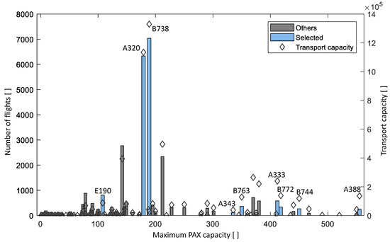 For the sake of general application, the 39 most used aircraft types were considered in the estimation of fuel consumption. For those aircraft of type t, specifications of emissions , range and seat capacity were considered. Taking into account the available flight plan of the selected time period, there are more than 300 different types of aircraft available.