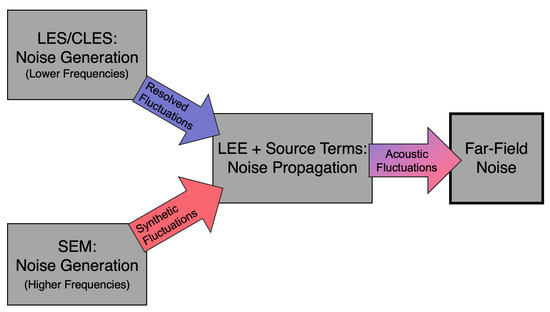 The main idea of CLST (as shown in Figure 2) is that resolved and modeled velocity fluctuations are coupled to generate a more complete noise spectrum. The CLST method combines coarse-grid large-eddy simulations (CLES) and a modified synthetic eddy method (SEM). Using a hybrid CAA method, the jet flow is simulated with the Navier–Stokes (NS) equations in a finite difference multi-block, structured LES solver. Velocity fluctuations produced by the NS LES/CLES solver are passed to the linearized Euler equations (LEE) to generate acoustic sources. The LEE solver then simulates the resulting noise field. The use of LES or CLES turbulence modeling ensures the resolution of large-scale turbulent fluctuations that correspond to low-frequency noise in the far field. Velocities generated by SEM are added to the source terms in the LEE to generate sources corresponding to the missing high-frequency noise. Figure 2 shows how the proposed CLST method modifies the CLES/LEE-based noise prediction scheme by adding the generation of synthetic fluctuations to model high-frequency content.