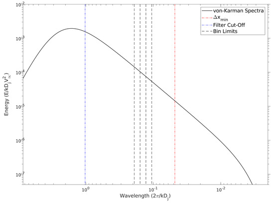 The eddy bins are divided into equal ratios for each bin, with . The bin ratio, , is the size increase from one bin to the next. For this work, is 1.145 based on the grid spacing and filter size. Table 1 shows the limits for each bin. The von-Karman turbulent kinetic energy spectra is plotted in Figure 4 for a representative point in the shear layer of a Mach 0.9 turbulent jet. The eddy size related to the fourth-order filter cut-off corresponds approximately to the most energetic large eddies, which is ideal for approximating CLES in the CLST framework. The distribution of eddies ensures that they reside within the range for isentropic turbulence and do not model the most energetic large eddies. The size of the synthetic eddies does not approach the dissipation range, but smaller eddies could be resolved by using a finer-spaced computational grid.