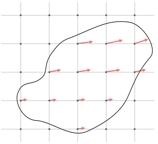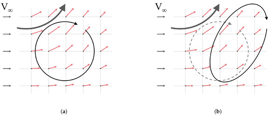 A representative diagram of sweeping due to pointwise convection and is given in Figure 6. Figure 6a shows the initial position of a small representative eddy in a flow field influenced by the rotation of a larger eddy. After applying pointwise convection to the eddy, displacement and distortion of the eddy shape due to sweeping and straining can be observed in Figure 6b.
