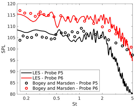 Pressure probes were placed in the near-field at the points listed in Table 2. The probes are divided into two categories. The first set is represented by four probes (P1–P4) equally spaced along the line y = 5Dj, which is close to the jet but far enough from the shear layer to avoid contamination of the acoustic data with hydrodynamic fluctuations. These points should give a good survey of observer locations where high-frequency noise contributes to the spectra. The second set is represented by two probes (P5 and P6) along the line y = 7.5Dj, which are use in a following section to validate the simulation with noise data from Bogey and Marsden [53]. Frequencies up to St = 5 were observed to be the highest frequencies resolvable on this computational grid at probe locations P1 to P4 [22] and St = 2 were the resolution limit for probes P5 and P6.