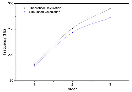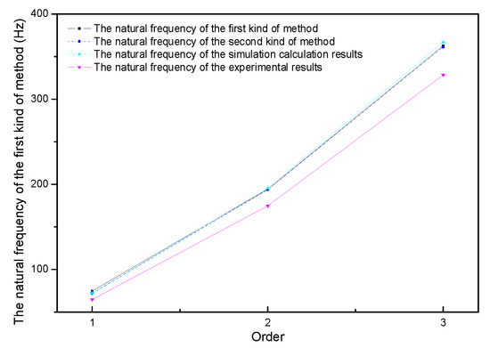 Under the second boundary condition, the theoretical calculation results were closer to the experimental results, possibly due to the fact that the second boundary condition is closer to the experiment since there will inevitably be errors in practice although the completely free constraint condition is simulated in the experiment as much as possible. Moreover, the simulation calculation results were closer to the theoretical calculation results under the first boundary condition. It is due to the fact that the completely free constraints in the simulation calculation are more in line with the constraint condition of the theoretical calculation under the first boundary condition.