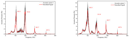 Figure 10 reveals the pressure amplitude-frequency characteristic curves at position 2 and 3, where the black solid lines referred to the original experimental results and the red solid lines referred to the results after the smoothing treatment.