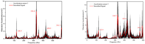 It could be discovered from Figure 13 that four peak accelerations appeared mainly within 600 Hz, the frequencies measured by the two sensors were fairly consistent, and the maximum peak frequency error was 0.75%, which was also ascribed to the spatial position difference between the measuring points.