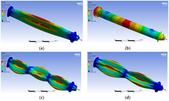 The mode of the cylindrical shell structure shown in Figure 2 was computationally analyzed. The material parameters of ordinary steel were selected for this shell structure, with the structural dimensions displayed in Figure 6. The first four order vibration modes of the engine shell are presented in Figure 13.
