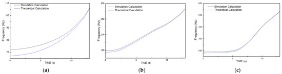 The theoretical calculation and simulation calculation results of the working time-varying first three order inherent frequencies of the rocket engine shell are as shown in Figure 15a–c.