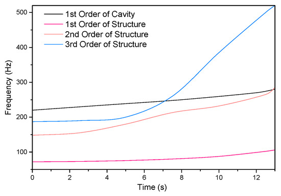 After the rocket engine worked from 0 s until 13 s, the minimum diameter of the internal acoustic cavity rose from 23 mm to 153 mm. The calculation method in Section 3.4.2 was utilized. The acoustic cavity model is shown in Figure 9, with the temperature of 3000 K, the density of 12.35 Kg/m3, and the sound speed of 1098.2 m/s. The acoustic mode of the acoustic cavity at each moment was obtained through finite element calculation. Figure 16 displays the comparison of natural frequencies of the acoustic cavity and the shell structure over combustion time.