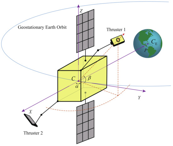 As we have stated before, the thruster configuration in this paper is characterized by two symmetrical robotic arms placed at the anti-nadir face of the satellite. Thrusters are installed on the platform at the end of two robotic arms, providing the motorization to enable a wider range of thrust direction. Figure 1 shows the model of a GEO satellite that applies this configuration in the RSW (radial, along-track, cross-track) coordinate system, where C and are the centers of mass of the satellite and the Earth, respectively. and P represents the sub-satellite point on the ground, whose longitude and latitude are supposed to be and . The X-axis is in the orbital plane and points to the anti-nadir direction, while the Z-axis is perpendicular to the orbital plane. The robotic arms are installed on the two corners of the satellite’s anti-nadir face symmetrically. Due to the requirement of the antenna direction, the attitude of the satellite shown in Figure 1 is fixed during the working of the communication module.