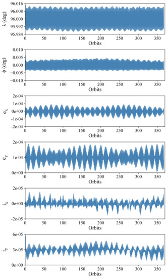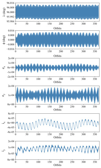 The primary objective of geostationary station-keeping is to prevent the longitude and the latitude of the GEO satellite from drifting too far. However, in addition to this primary objective, it is also necessary to control the eccentricity vector , the inclination vector , and the drift speed of longitude , which are important for the stability of station-keeping. Besides, some specific scenarios, such as the multi-satellite collocation, also have requirements for the eccentricity and inclination vectors [3]. Furthermore, due to the perturbations , , and have strong short-period oscillations, which makes it inconvenient for us to analyze their deviations. Therefore, we choose the mean elements to describe the orbital state of the GEO satellite, which could be written as