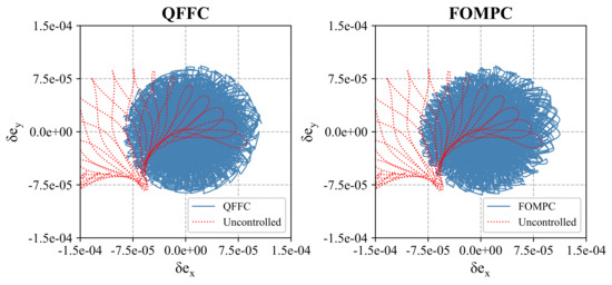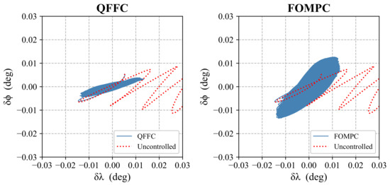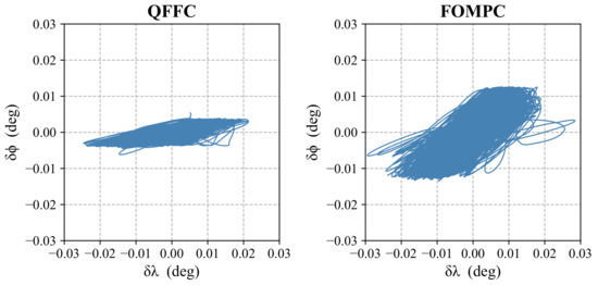 which represents a high-accuracy level considering the present technology. Magnifying NEDR by times and applying them in the algorithm, we perform similar Monte Carlo simulations to investigate the influence of the errors of different types and different magnitudes. As shown in Figure 15, the attitude error has almost no effect on the two controllers. However, Figure 16 suggests that raising the EDR of the determination results in a significant increase of the . This is because the determination error directly affects the accuracy of the predictive model. For both the QFFC and the FOMPC, the station-keeping becomes unstable after exceeds 800, indicating that the maximum EDR of the determination is , which is closed to the accuracy of the on-board real-time GNSS determination [44]. In Figure 17, we also present the trajectories in the plane with the maximum EDR of the determination. Compared with Figure 4, the control accuracy of the longitude has risen to for the QFFC and for the FOMPC. However, that of the latitude hardly changes, indicating that the stability of station-keeping for both the QFFC and the FOMPC is guaranteed under the condition of low determination accuracy.