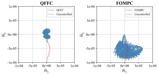 First, we carry out the one-year simulation for the two controllers. Figure 2 and Figure 3 present the time history of the osculating elements in the two simulations. Figure 4, Figure 5 and Figure 6 compare the trajectories in the , , and plane, in which the red dashed line represents the trajectory in the uncontrolled situation. It’s obvious that without station-keeping, the satellite will quickly drift away from the objective. The results of the two simulations show that both the QFFC and the FOMPC could achieve long-term stable station-keeping with the of and , respectively. The number of maneuvers during 365 orbits of the QFFC and the FOMPC are 728 and 721, suggesting that each thruster performs approximately one maneuver per orbit. The QFFC and the FOMPC have almost the same performance in controlling the longitude and the eccentricity vector. According to Figure 4 and Figure 5, the control accuracy for the longitude and the eccentricity vector is about and , respectively. The main difference between the two simulations is that the QFFC shows higher accuracy for controlling the inclination vector. That is because the QFFC requires the inclination vector to be fully adjusted to the objective at the end of each control cycle, while the FOMPC allows a certain deviation. Besides, Figure 3 shows that the inclination vector presents a more apparent periodic variation under the control of the FOMPC. To figure out the reason, we give Figure 7, which shows the half-year time history of the north–south velocity increment and Figure 8, which shows that of the average pitch angle . and are given by