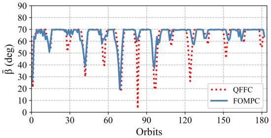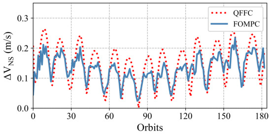 Compared with the blue curve representing the FOMPC in Figure 7, the red one representing the QFFC shows a larger variation, reflecting the impact of the solar and lunar gravitational attraction. Meanwhile, according to Figure 8, reaches its ceiling of most of the time in both simulations, indicating that the east–west velocity increment is usually forced to increase to adapt to the north–south velocity increment due to the constraint of the pitch angle. Therefore, by reducing the variation of , the above situation may be avoided, thereby improving the efficiency of station-keeping, explaining how the FOMPC manages to save fuel consumption. However, this will allow the inclination vector to vary with the solar and lunar gravitational attraction, reducing the control accuracy of the inclination vector, as shown in Figure 6. The average CPU times per orbit of the QFFC and the FOMPC are 0.09 s and 57.4 s, respectively. Although the FOMPC has higher computational requirements, considering further code optimization and the upgrade of the computing system on the satellite, the on-board application of the FOMPC is possible.