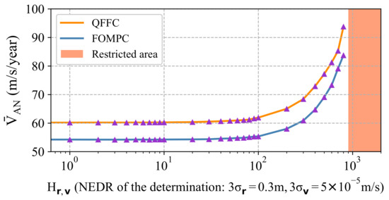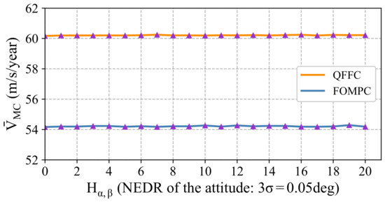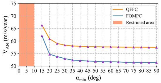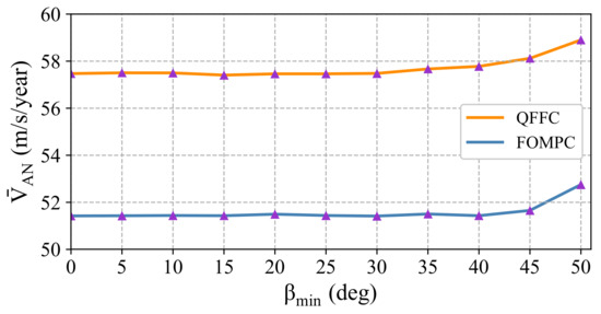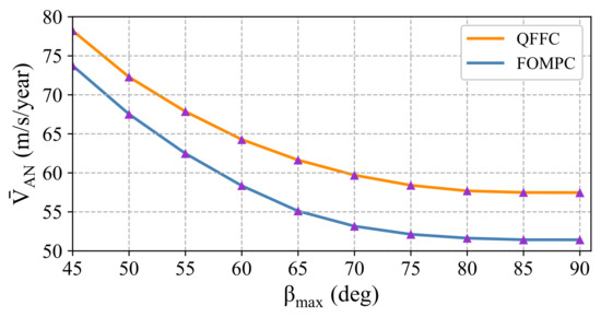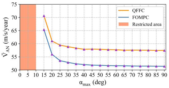 Next, we conduct the following simulations concerning the impact of different parameters and constraints. Due to the characteristic of the optimization algorithm, the results of each simulation will be slightly different, even if the parameters are the same. Thus, we apply the Monte Carlo simulation method [43], in which we repeat the same simulation 20 times and take the average annual velocity increment as the . Figure 9, Figure 10, Figure 11 and Figure 12 present the simulations for the constraints of the yaw angle and the pitch angle . When we change one of these parameters, the others are assumed to be , , , . The results show that the effects of , , , on the QFFC and the FOMPC are almost the same. has the largest impact on the efficiency of station-keeping. As increases from to , the drops from to for the QFFC and to for the FOMPC. The drop is more apparent when is less than , indicating that will remain a major limitation on the station-keeping efficiency until it reaches . On the contrary, according to Figure 10, has almost no influence on the until it reaches . According to Figure 11 and Figure 12, and have the similar impact due to the symmetry. The restricted areas in the two figures represent the values of and with which the controllers could not operate stably. Outside the areas, the influences of and declines fast and becomes negligible after and reach .