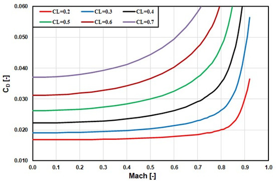 CD for new sweep and forward airspeed would amount to 0.00148 and 0.03395, respectively. Wave drag proportion of the total drag is now 4.4% and close to the usual cited figures of 5% for high-subsonic wide-body airplanes, again validating the accuracy of the approach in this study. Using Flight Management Systems (FMS), the operational airspeeds are economy Mach numbers, which minimizes total operating cost (fuel-cost and time-dependent cost). For more details on cruise speeds, ranges, and economy, see [